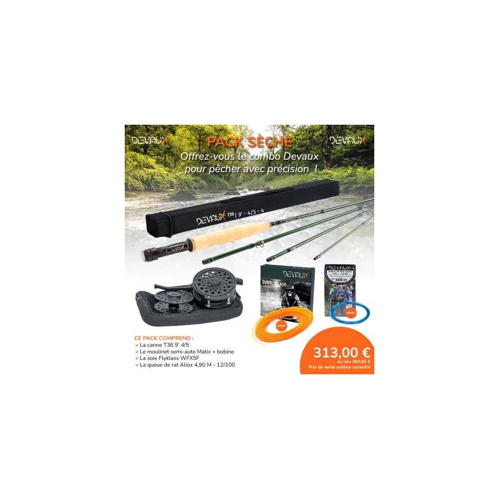 Le pack Sèche Devaux comprend: une canne T36 9’ 4/5, un moulinet semi-automatique Matix, une soie Flyklass WF5F et queue de rat Aliox 12/100.