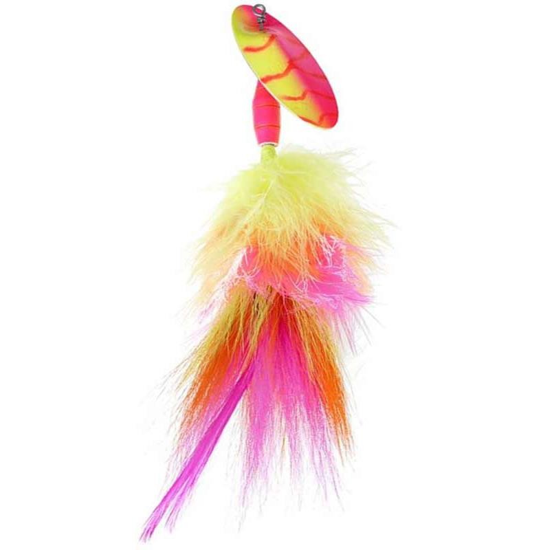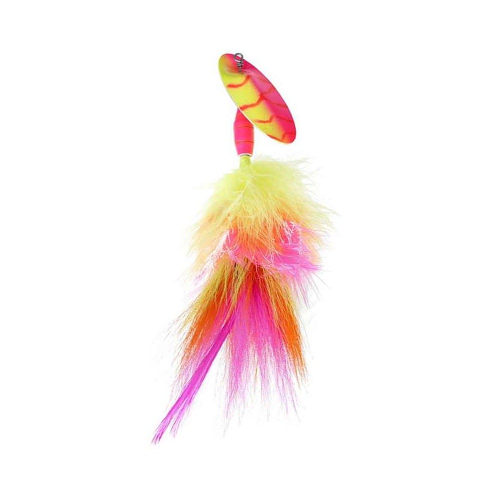 La Muskie Marabuck est une grosse cuillère tournante équipée d’un hameçon très solide conçue pour la traque des gros brochets et du silure. Elle est dotée d’une grosse palette de forme convexe/concave qui déplace énormément d’eau en émettant des flashs lumineux importants et d’un corps lourd surdimensionné en laiton agrémenté de nombreuses fibres de bucktail et marabout pour augmenter l’attractivité du leurre.