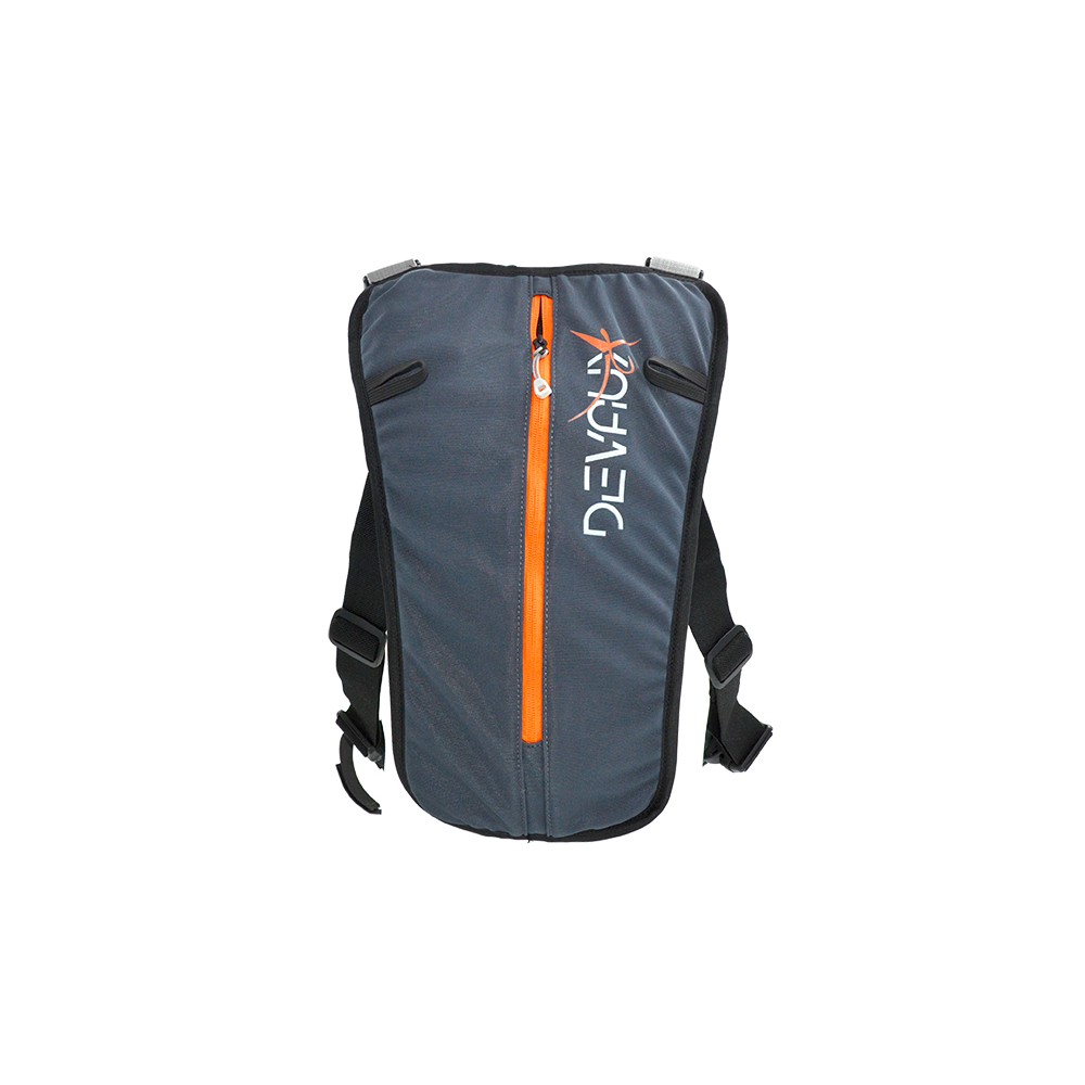 • Une grande poche dorsale légère, matelassée, aérée, zippée. Elle est amovible et dispose de deux boucles élastiques